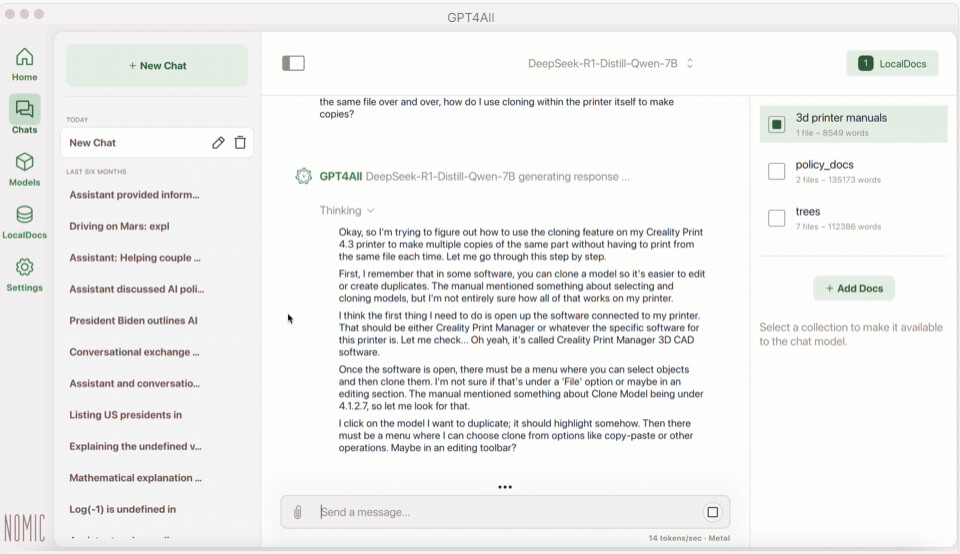 The cool thing about gpt4all is that it doesn’t only provide a chat but you have also the local docs feature which allows you to chat with your documents.