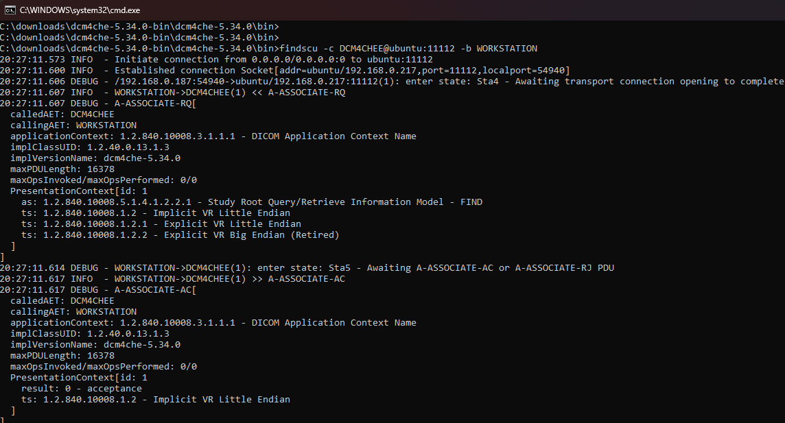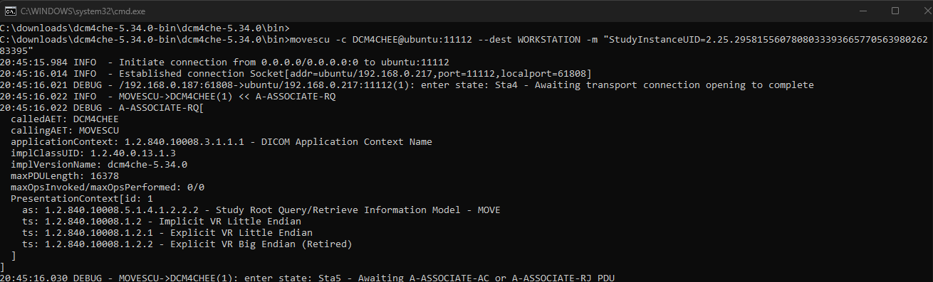For my test below I didn’t actually start storescp to listen for the study so it didn’t actually go anywhere but my PACS server did receive the command.